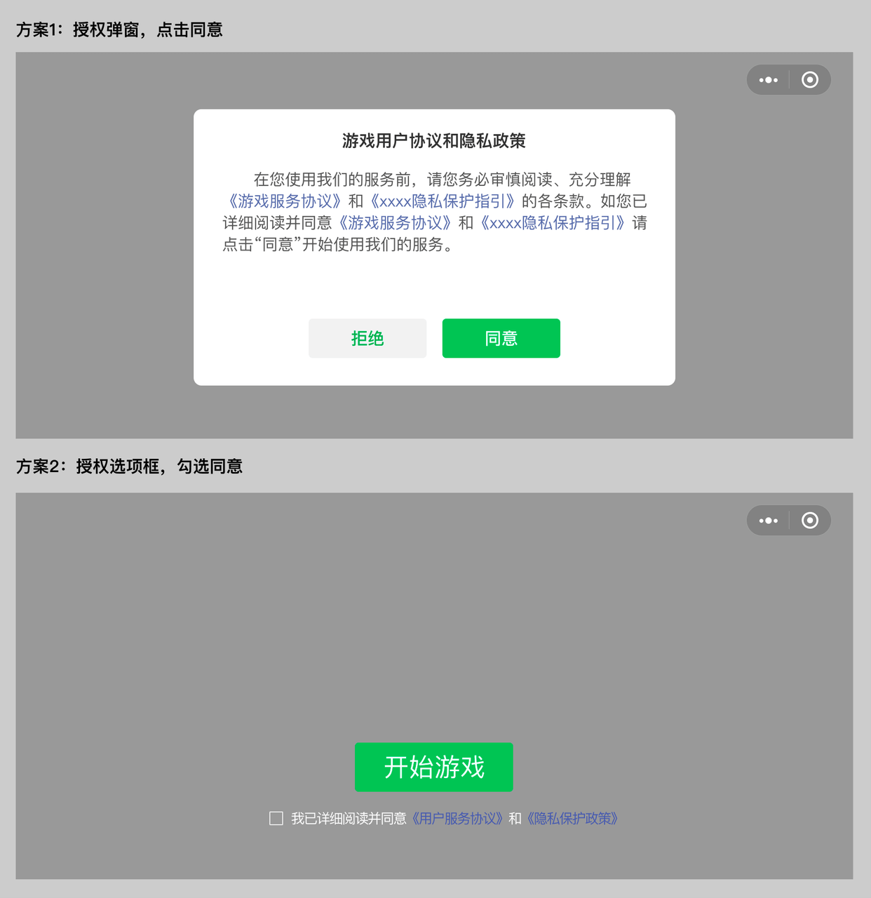 可以通过使用官方默认的隐私协议弹窗和自定义的隐私协议弹窗两种方式来提示用户授权,如果需要自定义隐私协议弹窗,可使用下面 API 实现。